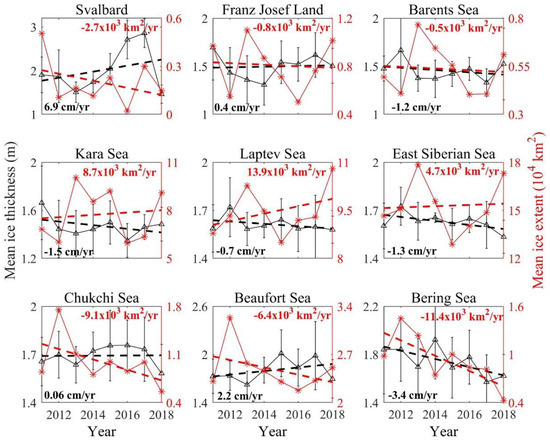 The January–April mean landfast ice thickness for the nine subregions (black triangles) and its linear trend (black dashed line) during 2011–2018. The red stars and dashed line represented the annual mean landfast ice extent and its linear trend for the corresponding period.