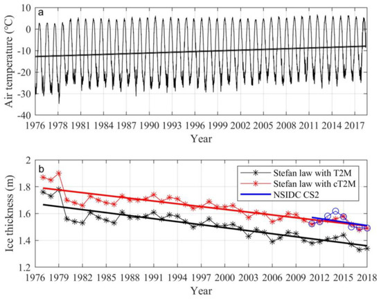 The calculations started with October 1 of each year in 1976–2018 and covered one year. The initial ice thickness was set to 0.01 m according to the thermodynamic ice model setup in the Kara Sea by Cheng et al. [50], who indicated that these calculations only referred to seasonal first-year landfast ice. The ECMWF daily T2M shown in Figure 10a was used as atmospheric forcing (). From 1976–2018, the monthly T2M in the landfast ice grid cells increased by 112.2 ± 76.2 × 10−3 K/yr, slightly larger than the trend in the sea ice grid cells in the entire Arctic (99.8 ± 73.4 × 10−3 K/yr). The calculated ice thickness, ranging from 1.3–1.8 m increased from Oct 1 and reached a maximum in April, which was consistent with the study results in the Kara Sea [50]. Here we compared mean ice thickness in April. From 1976 to 2018, mean ice thickness calculated by Stefan’s law decreased by −0.75 cm/yr using T2M as forcing (Figure 10b, black line with stars), A similar trend can be obtained from NSIDC CS2 products during 2011–2018 (−0.87 cm/a). However, the mean ice thickness was systematically underestimated by 0.2 m probably due to the warm bias of T2M over sea ice in the Arctic [36]. A new calculation was made using an offset of 3 °C on T2M as forcing. The results (red line with stars in Figure 10b) are in good agreement with NSIDC CS2 products. The Stefan’s law calculation captured the magnitude and trend of the landfast ice thickness evolution.