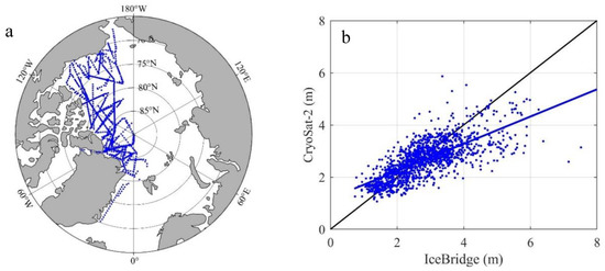 An independent assessment was carried out in this study. A longer time series dataset from NOAA’s Operation IceBridge from the Unified Sea Ice Thickness Climate Data Record of NSIDC was used as the baseline data [55]. In total, 1523 pairs of IceBridge data over March and April from 2011 to 2015 was available, as shown in Figure 12a. The corresponding sea ice thickness from CryoSat-2 was retrieved from the nearest grid cell to the IceBridge footprint. The mean bias was 0.16 ± 0.69 m, and the correlation coefficient was 0.73. For ice thinner than 2 m, which is the typical maximum thickness for landfast ice, the mean bias was 0.10 ± 0.48 m. The comparison in this study indicated that the CryoSat-2 data agreed well with IceBridge data, especially for the typical thickness of landfast ice (Figure 12b).