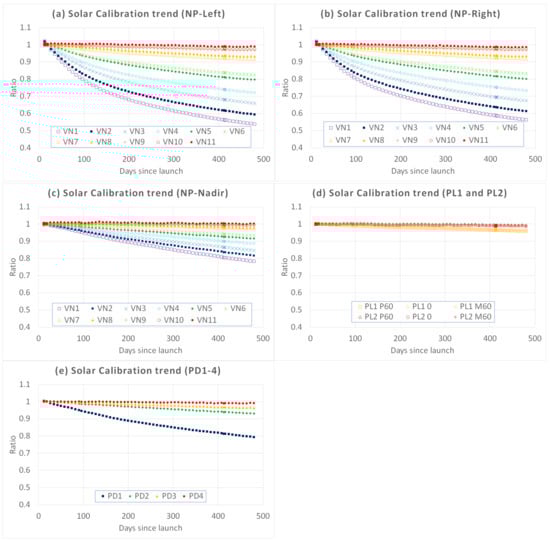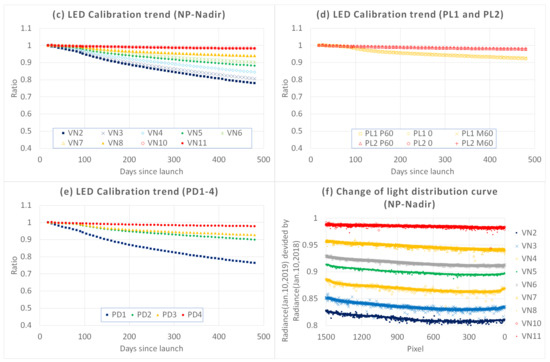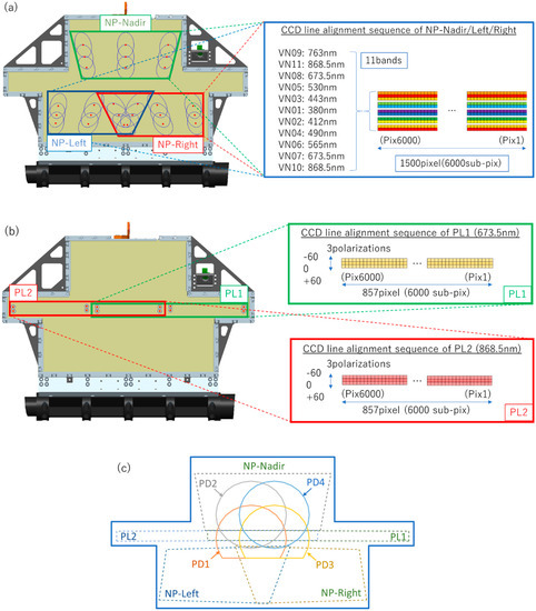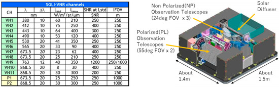 - Sakashita, T.; Tsuida, S.; Amano, T.; Shiratama, K.; Tanaka, K. Proto Flight Model (PFM) development status of visible and near-infrared radiometer (VNR) on the Second-generation Global Imager (SGLI). Proc. SPIE 2016, 9881, 98810S. [Google Scholar]