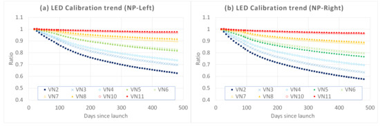 As is the case with solar calibration, the LED calibration trends of the telescopes and the PDs agreed with the degradation caused by UV irradiation as shown in Figure 8. Detectors operated at shorter wavelengths showed larger degradation on each telescope and PD and telescopes calibrated at longer solar-exposed areas of the diffuser (Figure 7) showed larger degradation, NP-Right ≈ NP-Left > NP-Nadir in descending order. Both telescopes and PDs showed inflection points around 100 days since launch, indicating that the intensity of the LEDs had degraded. Furthermore, the ratio of NP-Right degraded more than that of NP-Left (Figure 8a,b), which was possibly caused by the light distribution difference of the two LEDs. One of the LEDs illuminates the NP-Left side of the diffuser and the other one the NP-Right side of the diffuser, so the ratio of the NP-Nadir’s radiance distribution should be symmetric if the two LEDs keep the same light intensity. It can be seen that the ratio of the NP-Nadir’s radiance, as shown in Figure 8f, was not symmetrical, and it shows that the irradiance on the right LED degraded more than that on the left LED.