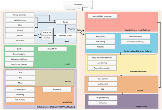 DIRSIG adopts an image-chain approach to Remote-Sensing simulation. It is capable to simulate passive broadband, multi-spectral, hyper-spectral, low-light, polarized, active laser radar, and synthetic aperture radar datasets. Its components include bi-directional reflectance distribution function (BRDF) predictions of a surface, time and material dependent surface temperature predictions, to the dynamic viewing geometry of scanning imaging instruments on agile ground, airborne and space-based platforms [4,5,6,7]. In a recent update called DIRSIG5 [8] Metropolis Light Transport (MLT) based path tracing has been used. Atmospheric processing can be performed by both MODTRAN5 and MODTRAN6 [9].