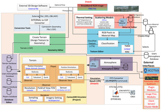 CameoSim is one of the earliest commercial HSI simulators and is feature-rich. It can require some effort from the end-user if all its features are to be exploited. CameoSim is developed in a modular fashion therefore features are divided into modules’ user interfaces, typically called editors. Figure 3 shows components of CameoSim and data flow.