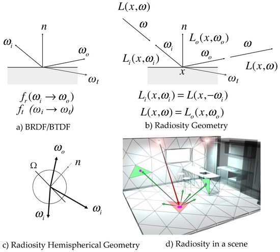 Figure 4 illustrates components of a radiosity rendering equation. Bidirection Reflection Distribution Function (BRDF) and Bidirectional Transmission Distribution Funtion (BTDF) represent the surface response on interaction with rays. Geometrical definition of sources is shown in Figure 4b and the hemispherical integration is included in Figure 4c. Equations (3)–(6) shows the rendering equation for CameoSim. Symbols and their meaning are explained in Table 3.