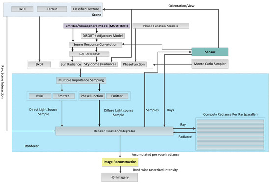 OSSIM is another HSI scene simulator that creates synthetic images of arbitrary complex scenes by rendering, the spectral range is in the visual and infrared (IR) bands, covering the 0.4–20 m spectral region. These images are radiometrically accurate and based on theoretical physics models. To allow for the subtleties and full scope of variability in atmospheric attenuation, the simulation employs all capabilities of the MODTRAN. The geometrical shape of objects and the terrain topography is described in terms of a three-dimensional complex hull, consisting of a set of flat, convex facets or polygons. Each polygon is assigned spectral radiometric properties, temporally variable spatial texture properties and radiometric properties. Polygons can also be partially transparent to represent gas clouds, countermeasure flares or aircraft plumes [13,14,15,16].