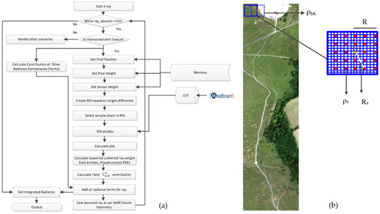 (a) Depicts the work flow of the proposed TIAEM model which features the computation of adjacency upwelling through the evaluation of volumetric scattering within terrain and sensor altitude dependent regional region of interest (ROI). (b) Shows an example for the evaluation of the background reflectance of the adjacency pixels (in red) for the test (target) pixel which is in orange/green.