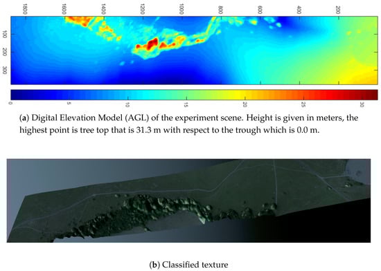 A flat polygon is transformed into the terrain by introducing DEM driven realistic bumps onto it. DEM is measured in Absolute Ground Level (AGL) for the test scene and it is shown in Figure 9a. The classified image from Figure 8b is mapped on the terrain to construct a classified texture, as shown in Figure 9b.