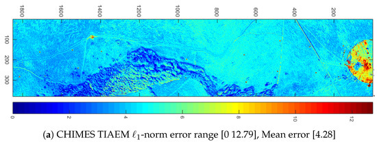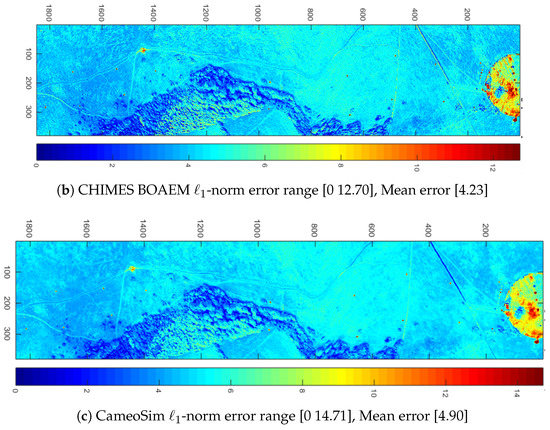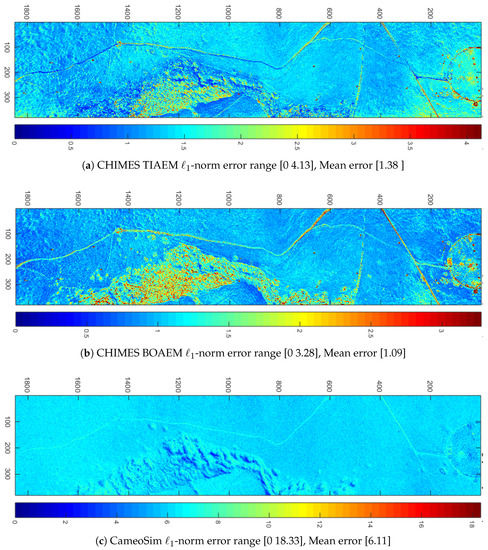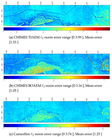 -norm error is calculated for the whole scene to show the extent of error and error pattern. -norm error is calculated by Equation (A2), where B is the number of spectral bands.