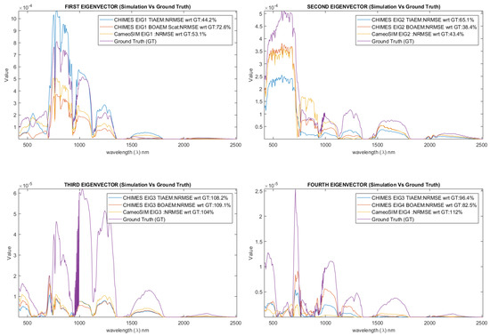 Flat Terrain: Radiance of a ROI (5 × 5) for Concrete. Mean, standard deviation of all simulations along with first three Eigenvectors of covariance are shown. NRMSE of entities with respect to GT is also calculated.