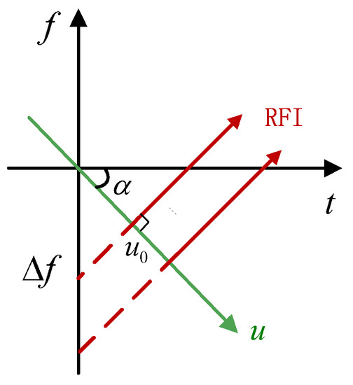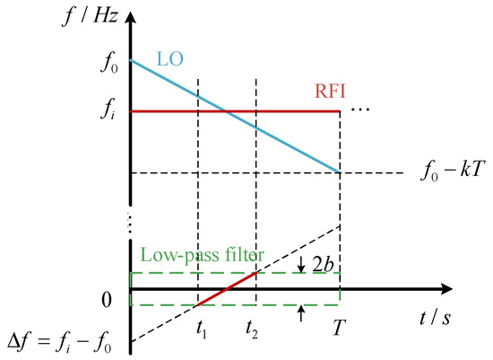 where , and are the complex envelope, the carrier frequency, and the initial phase of external RFI; is sweep period of radar. The received RFI is then mixed with LO and passed through a low-pass filter. The sketch map in Figure 1 represents the frequency variation of RFI before (the red line at the top of the sketch map) and after (the red line at the bottom of the sketch map) the processing in the receiver. The blue line represents LO of the radar, while and are the initial carrier frequency and the chirp rate of LO, respectively. The green dotted line represents a low-pass filter with a cutoff bandwidth . After being mixed with LO and passed through a low-pass filter, the original single-frequency external RFI was turned into a chirp signal with the opposite chirp rate of LO. The mathematical expression of the chirp signal is: