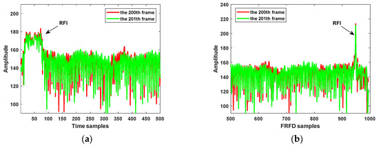 Original data with injected stationary RFI (with unvaried carrier frequency) in (a) time domain and (b) FRFD. The red line and green line represent samples from 200th and 201st sweep periods, respectively.