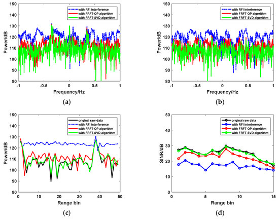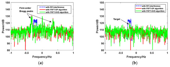 Doppler spectrums from the fifth (with sea clutter) and 37th (with target) range bin after RFI cancellation can be found in Figure 6a,b. The plus and minus first-order Bragg peaks remained unvaried with both methods, and signal-to-interference-plus-noise ratio (SINR) results of the target had a significant improvement from 3.2 dB to 11.5 dB with the OP-FRFD algorithm and to 10.0 dB with the SVD-FRIFD algorithm. Figure 6c shows spectrum of 50 range bins at −0.206 Hz in Doppler. The spectrum power for target remained high after processing, while interference in the background decreased obviously. The range spectrum with the SVD-FRIFD algorithm (the green line) was more constant with that of original (the black line), the root mean squared error (RMSE) was 0.11. While for the OP-FRFD algorithm (the red line), RMSE was 0.18. Figure 6d shows the SINR results of sea clutter for 15 range bins. Both methods effectively improved SINR, and the OP-FRFD algorithm yielded better SINR improvements than that of the SVD-FRIFD algorithm.
