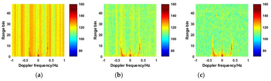 RDS representing (a) original data with injected RFI and target, (b) data processed with OP-FRFD algorithm, and (c) data processed with SVD-FRIFD algorithm.