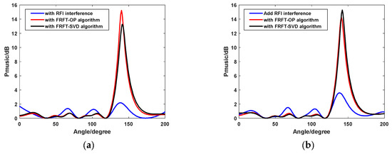 Figure 10 shows the angular response of the injected target before and after RFI mitigation using the multiple signal classification space spectrum estimation for both cases. The peaks of the mitigated results were 140° for the OP-FRFD algorithm and 141° for the SVD-FRIFD algorithm in Case 1, and in Case 2 was 142° for the OP-FRFD algorithm and 141° for the SVD-FRIFD algorithm. The mitigated results agreed well with the preset direction.