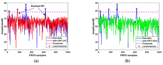 Figure 12a,b show the amplitude spectrum of original data from the 206th sweep period that processed with OP-FRFD algorithm and SVD-FRIFD algorithm, respectively. The dotted line is the threshold calculated, the scale factor , and the circles represent local maxima that identified as RFI. As a result, RFI was mitigated with both algorithms. Nevertheless, there was still residual RFI in the 167th sampling point with the OP-FRFD algorithm. By contrast, data sequence was more consistent with the original sequence after RFI mitigation with SVD-FRIFD algorithm, and there was no residual interference.