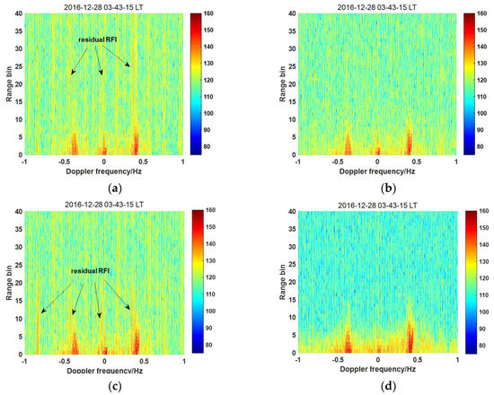 High-frequency surface wave radar (HF SWR) has the advantage of real-time monitoring over the horizon, and is widely applied for oceanographic parameters (such as current vectors, wind direction, and wave field) extraction [1,2,3] and the detection of surface vessels and low-altitude flying targets [4]. The performance of HF SWR degrades due to some unfavorable environmental conditions such as ionospheric clutter, terrestrial clutter, and meteor trail, as well as high intensity radio frequency interference (RFI) that congested in HF band (3–30 MHz) [5]. External RFI is composed of natural disturbances such as lighting strikes and human-induced interferences. In the daytime, the ionosphere D layer (principally absorbs radio waves) and F layer (mainly reflects radio waves) usually play the role of a shield against RFI. Due to the disappearing of D layer and the joining of F1-F2 layer in the ionosphere during nighttime, human-induced RFI utilizing sky wave propagation, such as short-wave communication and broadcasting signal, shows an obvious increase in HF band [5,6]. External RFI with great intensity (usually 20 dB higher than the internal noise) may significantly raise the noise level and greatly decrease the effective detection distance of HF SWR [7]. After the range and Doppler processing, RFI is dispersed in the entire range Doppler spectrum (RDS), and brings about substantial deterioration in sea state monitoring and target detection performance.