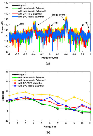 Doppler spectrums in the third range bin are presented in Figure 14a. Residual interference still existed in −0.85 Hz, 0 Hz, 0.77 Hz, and 0.95 Hz with time-domain Scheme 1 and OP-FRFD algorithm. Although interference was effectively mitigated with time-domain Scheme 2, there was frequency spreading which may cover up spectral points of real targets and severely increase the false alarm rate for target detection. Additionally, spurious signals generated in RDS may be misinterpreted by the current and wave algorithm, and deteriorate the accuracy of environmental remote sensing. By comparison, interference was suppressed completely and the sea clutter remained unvaried with the SVD-FRIFD algorithm. SINR results of plus Bragg peak for 11 range bins are presented in Figure 14b. The average increment of SINR for time-domain Scheme 1 was about 0.3 dB, while that increment for time-domain Scheme 2 was about 9 dB, for the OP-FRFD algorithm was about 2.7 dB, and for SVD-FRIFD was about 3.5 dB. Despite the time-domain Scheme 2 having the advantage of a higher SINR, the highly spreading frequency components of both first- and second-order Bragg returns may severely degrade the application prospects of the algorithm for surveillance and environmental remote sensing. The SINR results suggest that the SVD-FRIFD algorithm yielded better SINR improvement than the OP-FRFD algorithm after RFI cancellation. Compared with the traditional time-domain orthogonal projection methods, the proposed OP-FRFD algorithm and SVD-FRIFD algorithm are more applicable for RFI suppression of HF SWR.