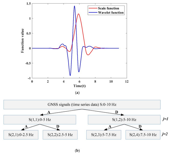 (a) Scale and wavelet functions of Sym6, (b) two decomposition level of 10 Hz Global Navigation Satellite System (GNSS) results.