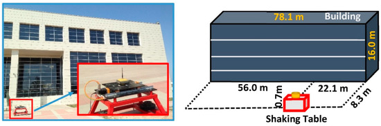 For implementation and testing of the proposed method, a rover GNSS receiver/antenna was installed on a shaking table, which was placed near a building, as illustrated in Figure 3. The building façade consists of glass and metal, which are reflective surfaces, causing multipath for GNSS observations. The shaking table was set up about 8.30 m away from the long side of the building. The height and width of the building are 16.0 and 78.1 m, respectively. The height of the GNSS antenna from the ground is 0.7 m. The building also blocks signals from some satellites, which will result in a degraded satellite geometry with high PDOP values.