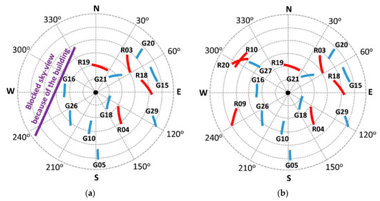 Two dual-frequency (L1 and L2) Topcon ™ HiPer-Pro GNSS receivers were used in this experiment. GPS and GLONASS observations were collected at a 10 Hz (0.1 s) sampling interval. A 10° elevation cut-off angle was used when collecting the observations from the satellites during the experiment. One GNSS receiver was mounted on the table, whereas the second receiver was installed approximately 100 m away from the rover at a known point, and it served as a base station for the relative positioning. The experiment was carried out on 17 September 2017 at the Gebze Technical University, Turkey. The experiment (GNSS session) lasted about 40 min. An average of 16 GPS and GLONASS satellites were observed at the base station, and 12 satellites were visible at the rover during the experiment. Figure 4 shows the sky-view of GNSS observations at both receivers. As can be seen, 4 satellites, 1 GPS, and 3 GLONASS were blocked by the building at the rover location.