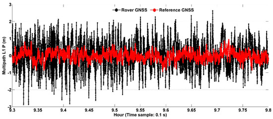 In order to demonstrate multipath effects on satellite observations collected by the rover receiver, the GPS satellites on L1 frequency were analyzed as a representative example. Since the estimation of multipath of phase measurements is a complex process, only the multipath of code observations was analyzed [46]. The satellite-specific P-code (L1) pseudorange multipath pattern for visible GPS satellites traces were generated using TEQC software and plotted for both the rover and base stations in Figure 5. In general, the multipath of all satellites at the rover station are larger than those at the base station. The multipath noises of satellite G15, G20, and G29 for both stations are relatively more than others due to having lower elevation angles [47]. Worth noting, due to the signal reflected from the building surface, some satellites, such as G16, which has a relatively high elevation angle of about 53°, experienced L1 pseodorange multipath at the rover station similar to other low elevation-angle satellites (e.g., G15, G20, and G29). To further analyze this phenomenon, L1 multipath traces of satellite G16 for both the rover and the base station are plotted as a superimposed time series (Figure 6). As can be seen from the figure, L1 multipath for the rover station is higher than that of the base station. The standard deviation of the L1 multipath of satellite G16 for the rover was 0.74 m, whereas it was only 0.27 m at the base station.