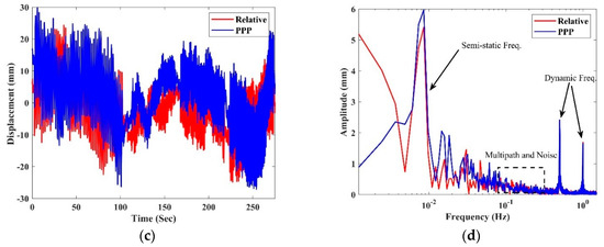 However, although previous studies accepted the accuracy of GNSS-PPP for estimating the dynamic components of motions, there is a lack of studies on the effect of multipath errors and observation noises on the results, as most of the PPP method testing was conducted in open sky areas [6,9,10]. The GNSS multipath errors and noises for static and dynamic movements are presented and discussed in [11,12,13], where the geometry of satellites and reflective surfaces are the main parameters affecting the multipath [14,15]. For vibration monitoring, multipath errors and GNSS observation noise are characterized by a frequency of less than 0.2 Hz [11,14,16]. These errors influence the accuracy of amplitude and frequency of measurements. For the high rate GNSS relative positioning solution, the multipath errors and measurement noise effects are evaluated and tested for the dynamic measurements [14,17]. However, the evaluation of the GNSS-PPP solution for seismic motions that are contaminated by multipath errors and dynamic noises is still limited. For the latter, results of previous studies showed that signal processing or filtering methods are a reliable tool to eliminate the observations errors and noises of vibration measurements [15,18].