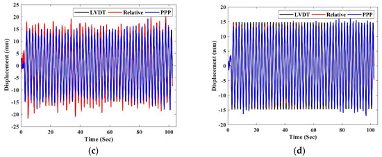 From Figure 8d and Figure 11, it can be seen that the correlation between GNSS techniques and LVDT observations is high. The ranges of displacements for the LVDT, GNSS relative positioning, and PPP in event 1 are 29.5, 32.4, and 33.5 mm, respectively. In event 2, the ranges are 9.4, 13.8, and 14.0 mm for the three methods. Moreover, the ranges of displacements of these methods (LVDT, relative GNSS positioning, and PPP) are 18.5, 21.1, and 20.6 mm, respectively, for event 3, and are 28.3, 29.8, and 30.2 mm, respectively, for event 4. The average accuracy of the range of GNSS relative positioning and PPP techniques is 80.94% and 79.77%, respectively, taking the LVDT measurements as the reference. Furthermore, the correlation between the dynamic movements extracted by the proposed method from GNSS and LVDT observations are calculated and presented in Table 2. From the table, a high correlation of the extracted dynamic component between LVDT and GNSS relative positioning and PPP results is observed. Therefore, the amplitude values can be extracted from the GNSS-derived displacement series using the proposed MSPCAW method, and one can conclude that the accuracy of the PPP method is suitable enough to extract the dynamic behavior of seismic motions.