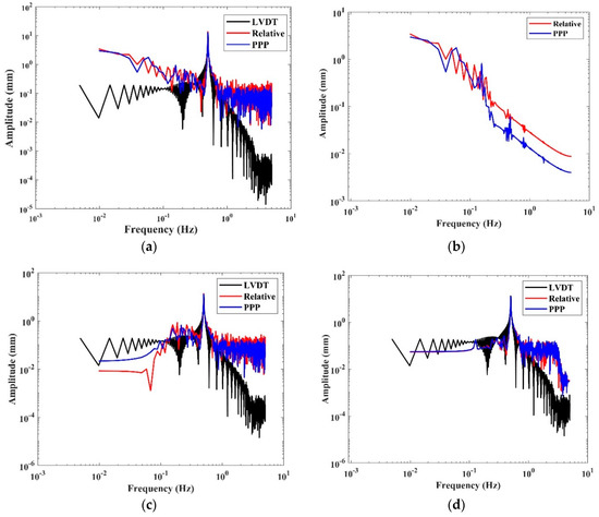 The spectrum evaluation of the four events is calculated and presented in Figure 13 and Table 4. The signals collected by the LVDT sensor and that calculated by the proposed method (MSPCAW) form the GNSS results are used. From the figure and the table, it can be seen that the GNSS methods provided high accuracy for estimation of the dominant frequency and amplitude when compared with the LVDT results. A significant frequency domain is clear for the three methods (LVDT, relative GNSS positioning, and PPP). The dominant frequency of movements measured by LVDT and GNSS is equal for all four events. In addition, the average variation of the amplitude of the movement, relative to LVDT measurements, is 0.54 and 0.62 mm for the GNSS relative positioning and PPP, respectively. Moreover, the correlation between the spectrum of the LVDT and GNSS results is high (an average of 0.97 for the four events). Likewise, the correlation between the spectrum of relative GNSS positioning and PPP techniques is also high (on average 0.99 for the four events). These results demonstrate that MSPCAW is an efficient denoising method for the extraction of the dynamic characteristics of motions from noisy GNSS data. Furthermore, similar to the relative GNSS positioning method, the PPP method can provide sufficient accuracy for the extraction of the dynamic behavior of strong motions.