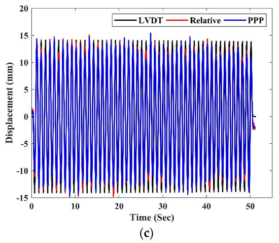With respect to the relative and PPP kinematic processing, the precision of the epoch-by-epoch obtained coordinates in both horizontal directions varies between 0.8 and 2.7 cm for the relative solution and between 1.9 and 2.5 cm for the PPP solution. The coordinates obtained from both relative and PPP solutions were converted to the local topocentric Cartesian system. Then, the topocentric coordinates were projected onto the movement direction of the shaking table.