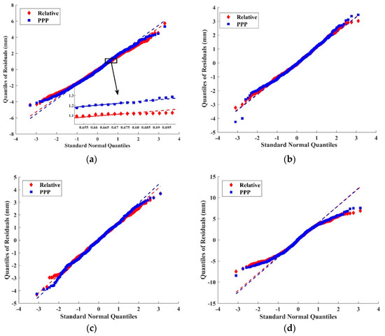 To study the type of the noise that affects high-rate GNSS observation used for detection of the dynamic motion of structures, the measurement’s residuals of GNSS techniques relative to LVDT measurements are computed and presented in Figure 12 and Table 3 for the four events. The quantile–quantile plot (Q-Q plot) is presented in the figure for the four events, where the standard normal quantile of the normal distribution was empirically plotted against the residuals of the events. The Q-Q plot is used to assess if a set of data plausibly came from some theoretical distribution such as a normal or exponential; more details can be found in Dodge [49]. In this plot, a reference fitting line is used to test the quartile of the data, a solid reference line connects the first and third quartiles (Q1 and Q3) of the data, and a dashed reference line extends the solid line to the ends of the data (see zoom-in in Figure 12a). To illustrate the quartiles, box-plots of events 2 and 4 are presented in the Figure 12e,f. In addition, Table 3 summarizes the statistical analysis of the GNSS errors for the four events in terms of the minimum (Min), maximum (Max), mean, std, skewness, and kurtosis of these errors. For all four cases, the differences were generally in the range of −9 to 8 mm, and the range of residuals of PPP is almost close to the range of the residuals of the relative positioning residuals.