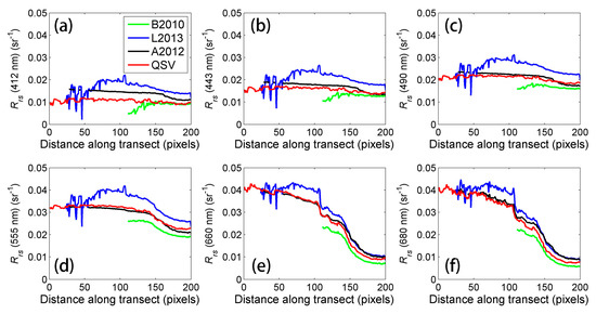 - Bailey, S.W.; Franz, B.A.; Werdell, P.J. Estimation of near-infrared water-leaving reflectance for satellite ocean color data processing. Opt. Express 2010, 18, 7521–7527. [Google Scholar] [CrossRef] [PubMed]