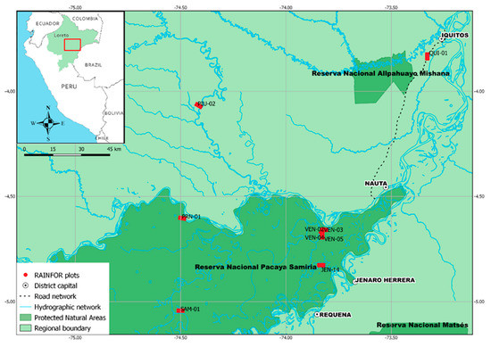 We surveyed ten 0.5 ha permanent forest plots (50 m × 100 m) that were already established in palm swamps dominated by Mauritia flexuosa, locally known as “aguajales”. Plots were established inside protected natural areas and in forests managed by local communities in the region of Loreto, in northeastern Peru (Figure 1). Each plot contains different densities of palm trees. The plots belong to the Amazon Forest Inventory Network (RAINFOR) and were established using a standard protocol [44]. Plot data are managed using the ForestPlots.net online database [45,46].