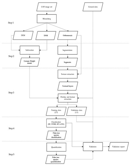 The UAV image processing comprised the following 5 steps: (1) mosaicking, (2) segmentation of the mosaic, (3) training samples preparation, (4) classification, and (5) palm tree quantification. Figure 2 shows the workflow. The mosaicking (Step 1) was carried out using the commercial software program Pix4D mapper [48] in a PC of 3.5 GHz 14-core with 128 Gb of RAM and an NVIDIA Quadro M4000 graphics processing unit (GPU). The rest of the steps were performed using the open-source software R v. 3.4.4 [49] in a laptop of 2.6 GHz quad-core with 16 GB of RAM and an NVIDIA Quadro M1000M graphic card. All the scripts generated in R, are available on the Github repository (https://github.com/xime377/UAV-classification). To speed up the testing process, the HPC Manati cluster was used. It has a coordinator node (Intel Xeon E5-2680 v4 2.40Ghz of 56 cores with 64 GB of RAM) and 9 processing nodes (Intel Xeon E5-2680 v4 2.40Ghz of 28 cores with 64 GB of RAM per node), 6 of these nodes have an NVIDIA Tesla K80 graphic card.