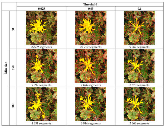 Matrix of the segmentation parameter combinations and their results. The number of segments stated in each cell corresponds to the value obtained for the whole mosaic. The segments (red lines) are overlaid in the mosaic. Only the segments that correspond to the E. precatoria palm tree (a crown with an elongated star shape) are highlighted in yellow. With smaller minsize and threshold values, there will be a higher number of segments (delimited by the red contour); with higher values in both parameters, there will be a smaller number of segments, but also less distinction among the leaves of different palm tree leaves.