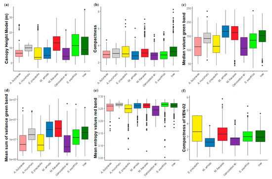 Impact of species discrimination per classification features. Each species has a different boxplot color. The first five graphs (a–e) contain all the training data from all the RAINFOR plots and show the best predictors for palm species identification: (a) the canopy height model; (b) the compactness of the segments; (c) the median of the green band values per segment; (d) mean of the sum of the variance of the green band values per segment; (e) and the mean entropy of the red band values per segment; (f) Shows the compactness of the segments from the training data used for the VEN-02 plot.