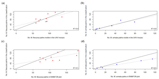 Palm species quantification results. The red dots correspond to the Mauritia flexuosa data and the blue dots correspond to the Mauritiella armata data. The black line represents the 1:1 relationship and the dotted line belongs to the linear regression. Comparison between the results obtained from the classification and the number of palm tree species visible in the UAV for (a) Mauritia flexuosa; and (b) Mauritiella armata, and the comparison between the results obtained from the classification and the number of palm tree species with more than 10 cm of dbh registered per plot (RAINFOR ground data) for (c) Mauritia flexuosa; and (d) Mauritiella armata.