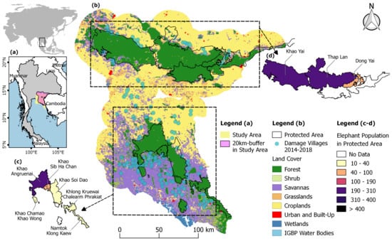The study area in Eastern Thailand (a). The area is dominated by croplands and savannas, while the damaged villages are located near the forests (b). Human–elephant conflict was modeled within 20-km buffers generated around the nine protected areas (c, d), which are natural habitats for elephant populations.