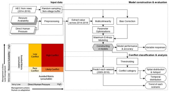 Flow chart of the study. Two models for each season under resource availability and direct human pressure were constructed. Projected probability during 2009–2018 were classified and overlaid using proposed conflict category.