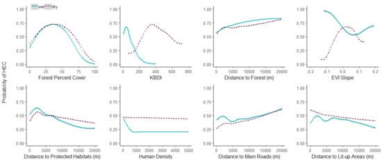 Figure 3 shows how the HEC probability changes as each environmental predictor is varied, while keeping all other environmental variables at their average sample value. The response of Forest Percent Cover was similar for both seasons. In the highest and lowest forest densities, lower HEC probability was expected, while higher HEC probability was found in moderate forest densities. For KBDI, higher probability of HEC in wet season occurred at low KBDI, with a continuous reduction after KBDI of around 50. In the dry season, however, HEC probability peaked at intermediate KBDI around 300–400 and decreased slowly. The response of EVI Slope for the wet season indicated that HEC was more likely to occurred where vegetation conditions were changing (diverted from zero), the highest HEC probability occurred when EVI was reducing over the season. In the dry season, however, probability of HEC was higher when EVI was relatively stable (EVI of zero) or increasing slightly (EVI of 0.05), indicating green-up of vegetation. The patterns of EVI slope from both seasons corresponded to the characteristics of EVI slope from forest and savanna land cover (Figure S1). For human pressure, response of Distance to Protected Habitats, Distance to Main Roads, and Distance to Lit-up Areas had similar characteristics for both seasons. In the dry season, a slower reduction in HEC probability was observed for Distance to Protected Habitat and Distance to Lit-up Areas as distance increased. For Human Density, HEC probability in the wet season reduced as density approached 1000 person/km, but did not affect HEC probability in the dry season. Possible higher tolerance to high human pressure of elephants was captured in dry season.