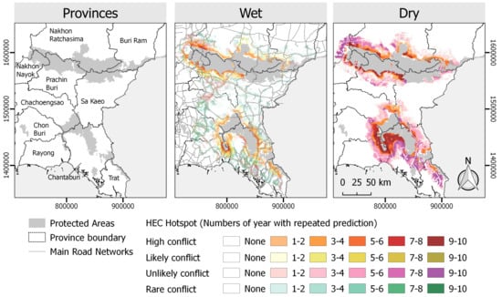 The potential for HEC occurrence was higher during the dry season: High and Low conflict areas were larger and more frequent. In contrast, during the wet season, the Likely and Rare conflict categories were more frequent, suggesting lower HEC potential. The hotspots of High conflict category were concentrated around the south and south-west of Ang Ruenai-WS in Chonburi, Rayong, and Chantaburi provinces (Figure 4). In the north, smaller clusters, especially near the protected areas, was predicted in Nakhon Ratchasima, Nakhon Nayok, and Prachinburi provinces. The high HEC zones shrunk closer to the protected areas in the wet season and mainly located around Khao Chamao Khao Wong-NP at the border between Rayong and Chantaburi, east of Khao Soi Dao-WS in Chantaburi, and northwest of Khao Yai-NP in Nakhon Ratchasima. Additionally, our models estimated that many areas under High conflict category in the dry season changed to Likely conflict category in the wet season. This result implied that such locations have potentially experienced year-round HEC in different levels (e.g., intensity or frequency). Low conflict class was predicted in large areas in the dry season, affecting all provinces. Although less in frequency and intensity, in the wet season coldspots of Low and Rare conflict categories were concentrated around the main roads, with some areas located far from protected areas.