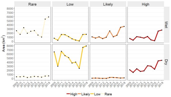 During 2009–2018, overall areas of potential conflict were estimated to be increasing as shown in Figure 5. The increasing trend of High HEC was captured in both dry and wet season, although the peak values were lower in the wet season. Potential HEC areas expanded more than double between 2016 and 2017, of which areas with High conflict increased from 2235 to 4306 km and 115 to 2467 km in the dry and wet season respectively. The dry season was dominated by two conflict categories: High and Low. On the other hand, similar trends were presented across all conflict categories in the wet season despite variations of affected areas among the years. For Likely conflict, the wet seasons had a similar increasing trend to that of the High conflict category. However, the dry seasons had relatively stable areas of the Likely and Rare HEC.