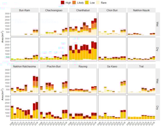 Chantaburi was estimated to have the largest areas of HEC, followed by Nakhon Ratchasima (Figure 6). In Chantaburi, large areas of High HEC (~900 km) were estimated in the dry season from the beginning of the study period. The province showed an increase in overall areas of conflicts, as well as the largest area expansion of High HEC captured in the wet season, from 170 km in 2009 to 689 km in 2018. Nakhon Ratchasima also had large HEC-prone areas, but the High conflict category showed a large increase only from 2014 onward. Similar to Nakhon Ratchasima, Buri-Ram and Chachoengsao were predicted with High HEC from 2014. Except Nakhon Nayok and Trat, all provinces were predicted to have a larger area of High conflict category during the dry season. HEC areas were increased more than double from 2016 to 2017 in Buri-Ram, Chachoengsao, Chantaburi, Nakhon Ratchasima, Prachinburi, Rayong, and Sa Kaeo. On the other hand, a decrease in the areas of HEC was identified in 2010 and 2014–2016 for most provinces.