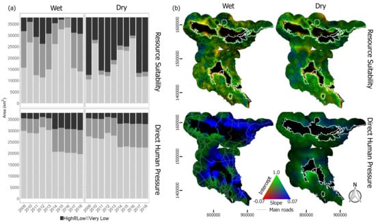 (a) Temporal distribution of areas predicted as High, Low, and Very Low category during 2009–2018. (b) Changes in HEC probability from 2009 to 2018 under resource suitability and direct human pressure scenarios. Each location presents two values, a slope and an intercept. The maps are visualized using RGB composite, Red: negative slope (decreasing trend), Green: intercept (baseline of HEC probability in 2009), and Blue: positive slope (increasing trend).