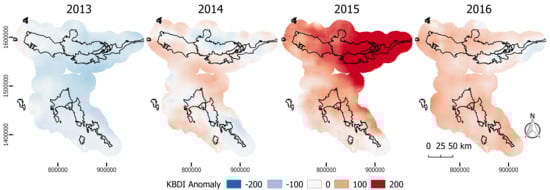 Anomaly of Keetch–Byram Drought Index (KBDI) showed large positive value in 2014–2016 compared to relatively normal condition in 2013. Positive KBDI anomaly indicated deficit of soil moisture, which is suspected to restrict the availability of resources and alter the potential HEC distribution.