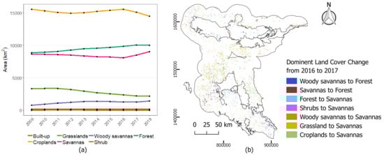 (a) Areas of different land cover types from 2009 to 2018 based on the reclassified MODIS land cover classes (b) Dominant land cover changes detected from 2016 to 2017.