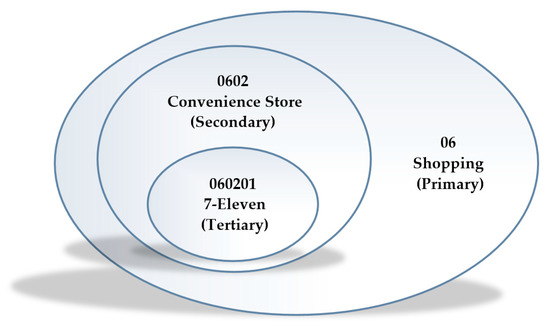 The Gaode map uses a three-level classification system for POI data (Figure 3). The category code for each POI datum consists of a six-digit decimal number; the first two digits of the category code represent the primary category; the middle two digits represent the secondary category, and the last two digits represent the tertiary category. The higher the classification of the category, the more detailed the classification of the data. The Gaode POI data have 23 primary categories, 264 secondary categories, and 869 tertiary categories. This study focuses on the primary category of Gaode POI data.