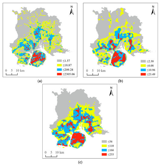 In order to transform POI and RN datasets into input format of the same scale suitable for the classifiers, KDE was used to convert the datasets into intensity maps (Figure 4a,b). A map of the NTL data was also generated (Figure 4c).