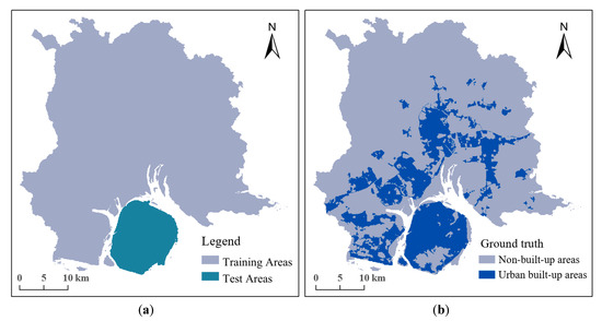 The ground truth which was used consisted of a collection of maps of the distribution of real urban built-up areas in Xiamen City provided by the Xiamen Municipal Natural Resources and Planning Bureau (Figure 5b). These maps were binarized, with a value of 1 being used for the urban built-up areas and a value of 0 being used for the non-built-up areas.