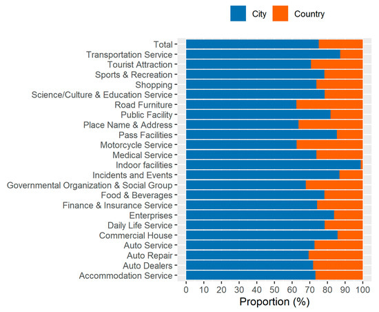 A typical Gaode POI record, such as the Bird’s Nest, is: {“id”: “B000A7GWO5”, “name”: “National Stadium”, “type”: “Sports and Recreation Service; Sports Venue; Comprehensive Gymnasium”, “typecode”: “ 080101”,”address”: “National Stadium South Road No. 1 Olympic Park”, “location”: “116.395777, 39.993427”, “citycode”: “010”, “cityname”: “Beijing”, “alias”: “Bird’s Nest “, …}. The “adname” field records the name of the county-level administrative region of the POI data. In the naming rules for the division of county-level administrative districts in China, the names of all administrative divisions include the following suffixes (in Chinese characters): “Zone”, “City”, “Domain”, “Flag”, “County”, “Island”, and “Administration”. Among these, the administrative division units whose names are suffixed with “district” and “city” are mostly distributed inside the urban built-up area. The administrative divisions whose names are suffixed with “domain”, “flag”, “county”, “island”, and “administration” are mostly distributed in the non-built-up areas. Based on the different suffixes of the “adname” field, a search for the “adname” field was conducted from more than 60 million POI data records for China. Then, the Transact SQL (T-SQL) statement in the SQL server was used to calculate the proportions of the various categories POI data that represent urban built-up areas and non-built-up areas (see result in Section 3.1).