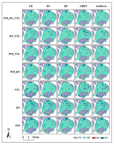 A total of 35 combination results were generated by BAIC using five classifiers and seven types of input data (Figure 7). Overall, there were more false negatives (FNs) than false positives (FPs) in the two situations where BAIC failed. Of all the data types, RN data clearly had the largest variance in spatial morphology because a large number of massive block urban built-up areas inside the test area were incorrectly identified as non-built-up areas. The combinations of two or three types of data had a lower spatial variance compared to single-input data. Of all the classifiers, the ensemble methods of RF, AdaBoost, and GBDT achieved a more stable classification performance than the traditional methods of LR and DT.
